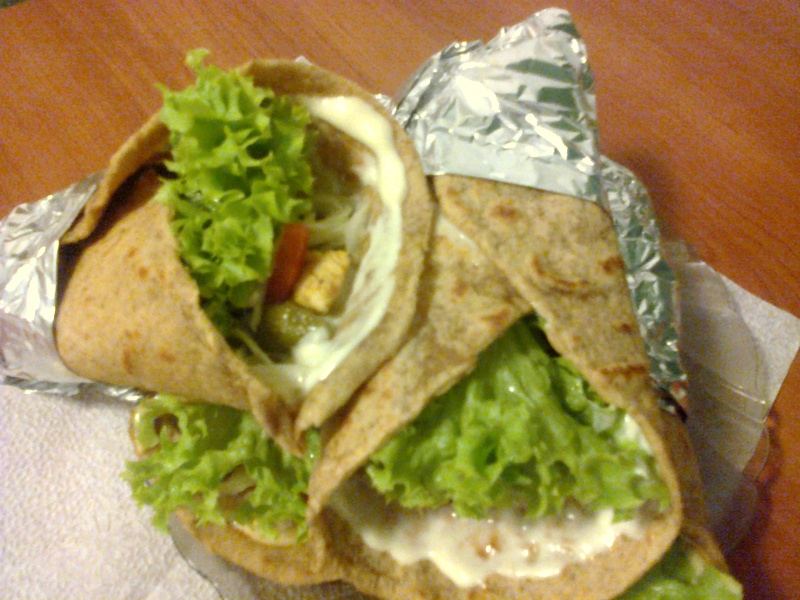 Asamblare: intindeti sosul ales pe o lipie; puneti pe mijlocul lipiei un rand de bucatele pui, peste ele 2-3 felii de rosii, apoi 3-4 feliute castraveciori murati; puneti varza si cateva fire de ceapa julien; impachetati, inveliti baza cu folie aluminiu si serviti.