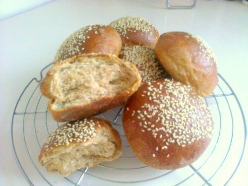 Le acoperiti cu folie plus servet( ca sa nu se usuce la suprafata) si le lasati la dospit inca 30 minute. Apoi, le ungeti cu un galbenus batut cu putina apa sau cu un amestec de premix si apa ( 1 lingurita de premix cu 2-3 linguri apa), le presarati cu diverse seminte si le bagati in cuptorul incins la 165 grade. Se coc pana devin rumene, cca 30 – 35 minute.