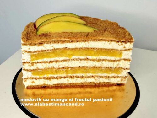 Medovik exotic: tort cu miere, mango si fructul pasiunii